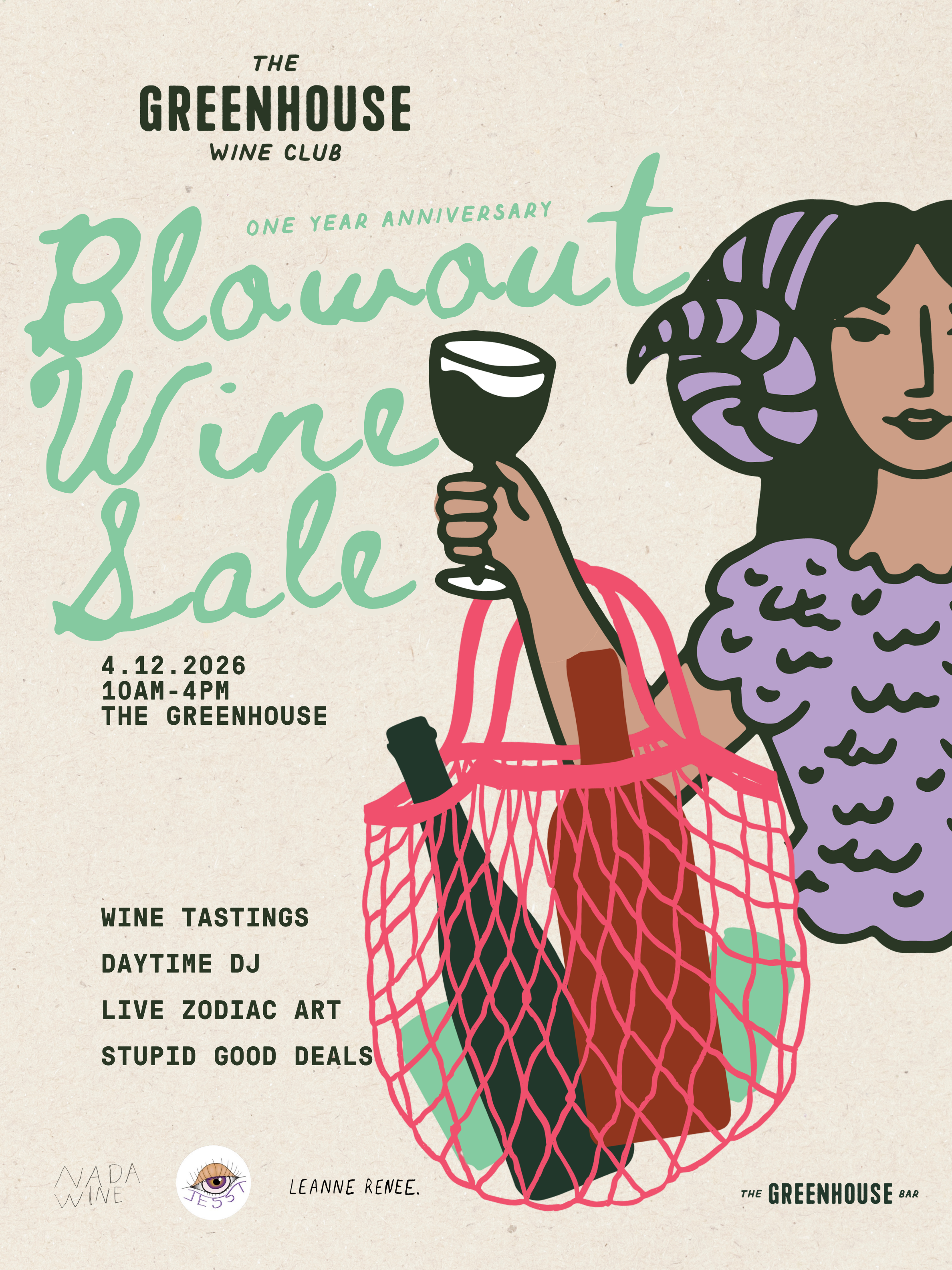 join us as we celebrate one year of the greenhouse wine club with, what else? a bunch of really f*#king good wine. all of our bottles will be discounted & one of our fave wine distributors, Nada, will be tasting out some truly gorgeous wine (including a sneak peek of a wine club wine for gemini season!). We will have a live DJ partying all day with us while we drink & shop and get our little portraits sketched zodiac style by Leanne Renee. We cant wait to see you there!